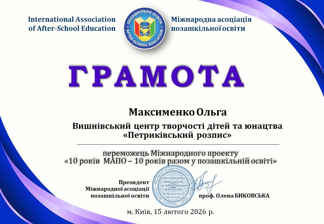 Міжнародний проєкт «10 років МАПО – 10 років разом у позашкільній освіті», реалізований до 10-річчя Міжнародна асоціація позашкільної освіти, об’єднав однодумців спільної мети — розвитку якісної, сучасної та доступної позашкільної освіти.