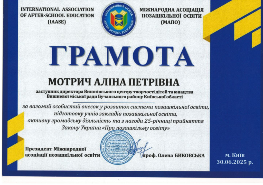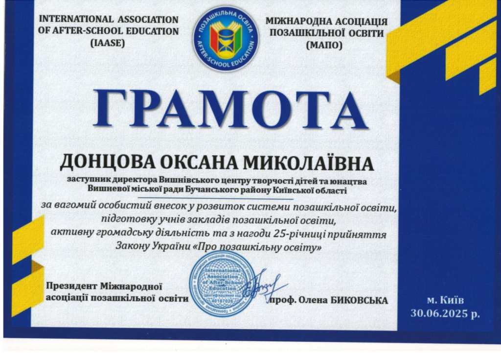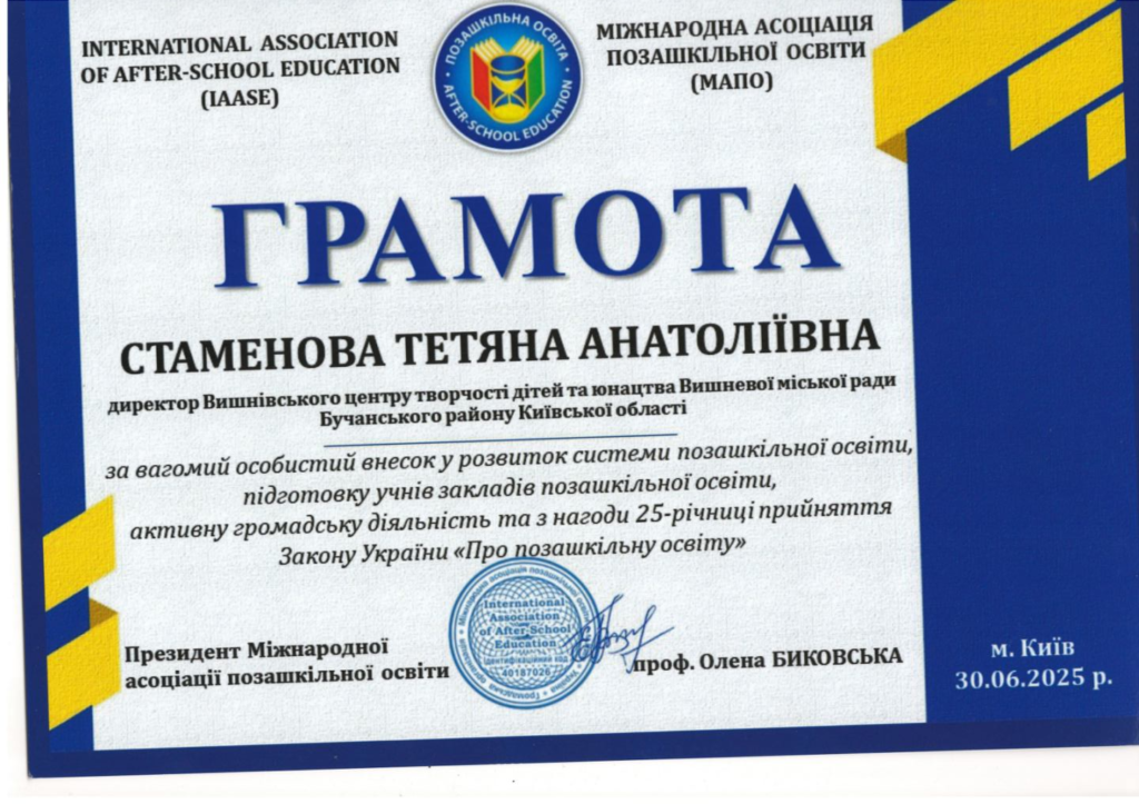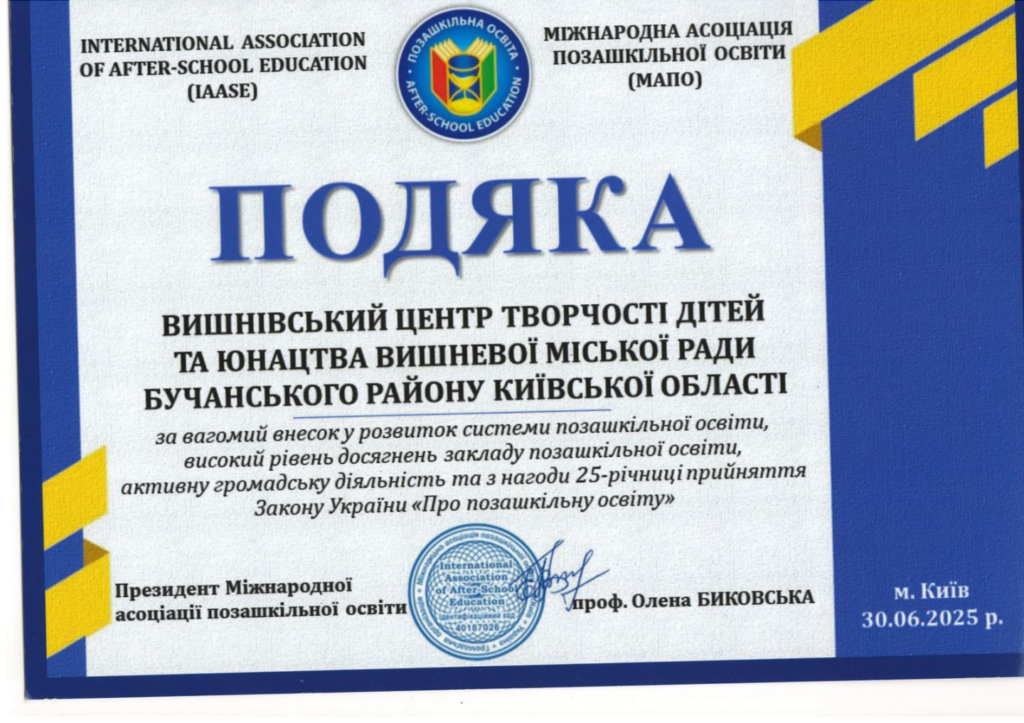 Пишаємося високими нагородами нашому закладу ! Подякою Міжнародної асоціації позашкільної освіти за вагомий внесок у розвиток системи позашкільної освіти, високий рівень досягнень закладу позашкільної освіти нагороджено педагогічний колектив Вишнівського центру творчості дітей та юнацтва. Грамотами за вагомий особистий внесок у розвиток системи позашкільної освіти, високий рівень досягнень закладу позашкільної освіти нагороджено директора Тетяну Стаменову, заступників директора Оксану Донцову та Аліну Мотрич.