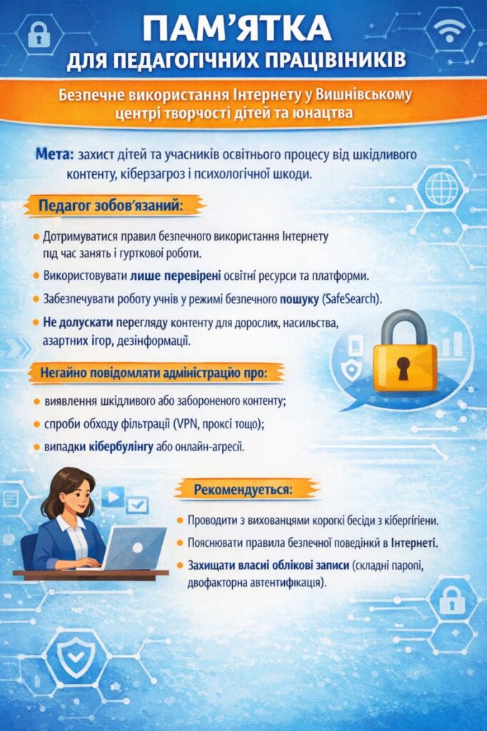 У Вишнівському центрі творчості дітей та юнацтва ми дбаємо про створення безпечного цифрового середовища для вихованців. Саме тому підготували інформаційні пам’ятки з онлайн-безпеки для педагогів, батьків та вихованців гуртків.