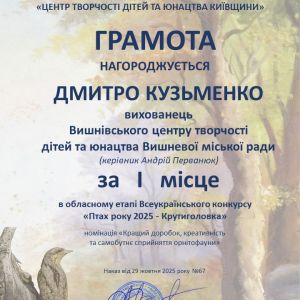 Підбито підсумки обласного етапу Всеукраїнського конкурсу “Птах року 2025 – Крутиголовка”!Щиро вітаємо вихованців Вишнівського центру творчості дітей та юнацтва із заслуженими перемогами!I місце у номінації «Кращий доробок, креативність та самобутнє сприйняття орнітофауни» посіли:Мокроусова Вероніка, вихованка гуртка «Ліплення» (кер…