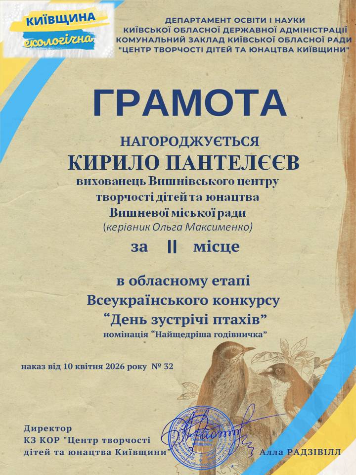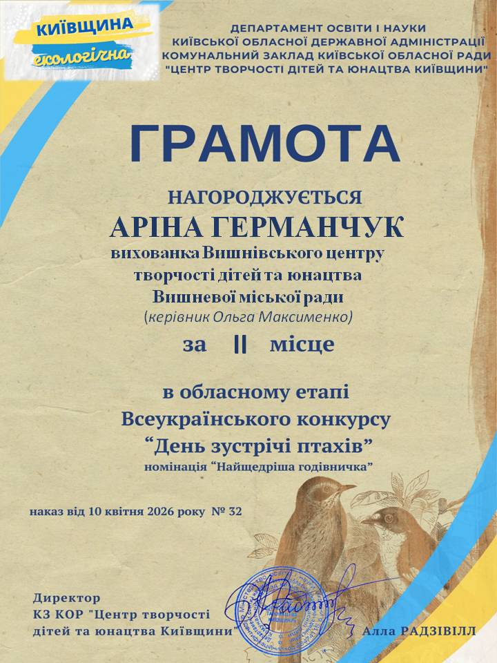 Щиро вітаємо переможців Вишнівського центру творчості дітей та юнацтва у Всеукраїнському конкурсі «День зустрічі птахів»!